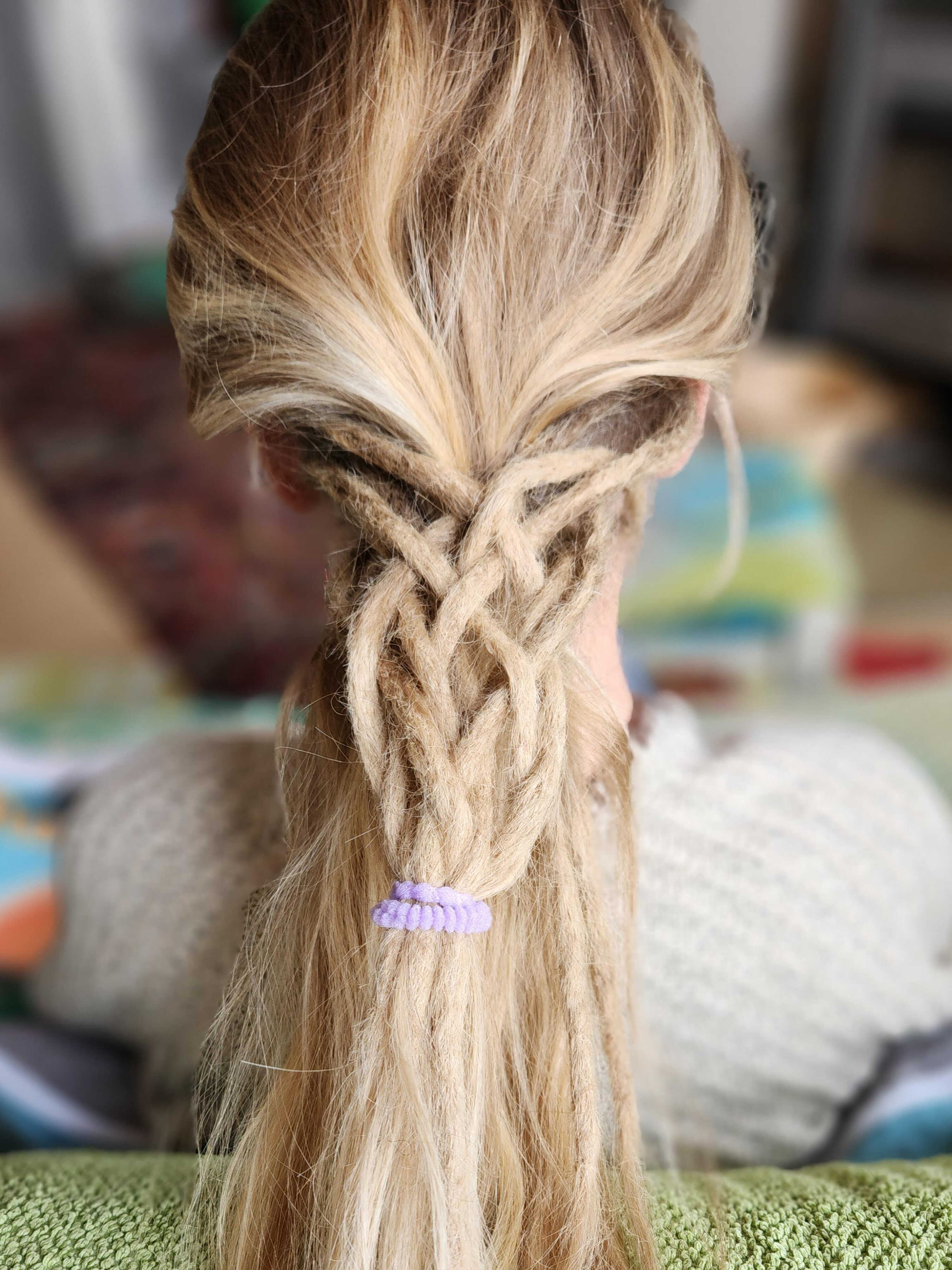 - Ausführung: Welche Methode kommt zum Einsatz? Ich teile die Dreads in einem Wabenmuster ein und arbeite mit der Toupiertechnik (Backcombing) oder auch mit Twist und Rip,(hier werde die Strähnchen gezwirbelt und auseinander gezogen) wenn deine Haarstruktur dafür geeignet ist. Am Ende wird mit unterschiedlichen Methoden gehäkelt.